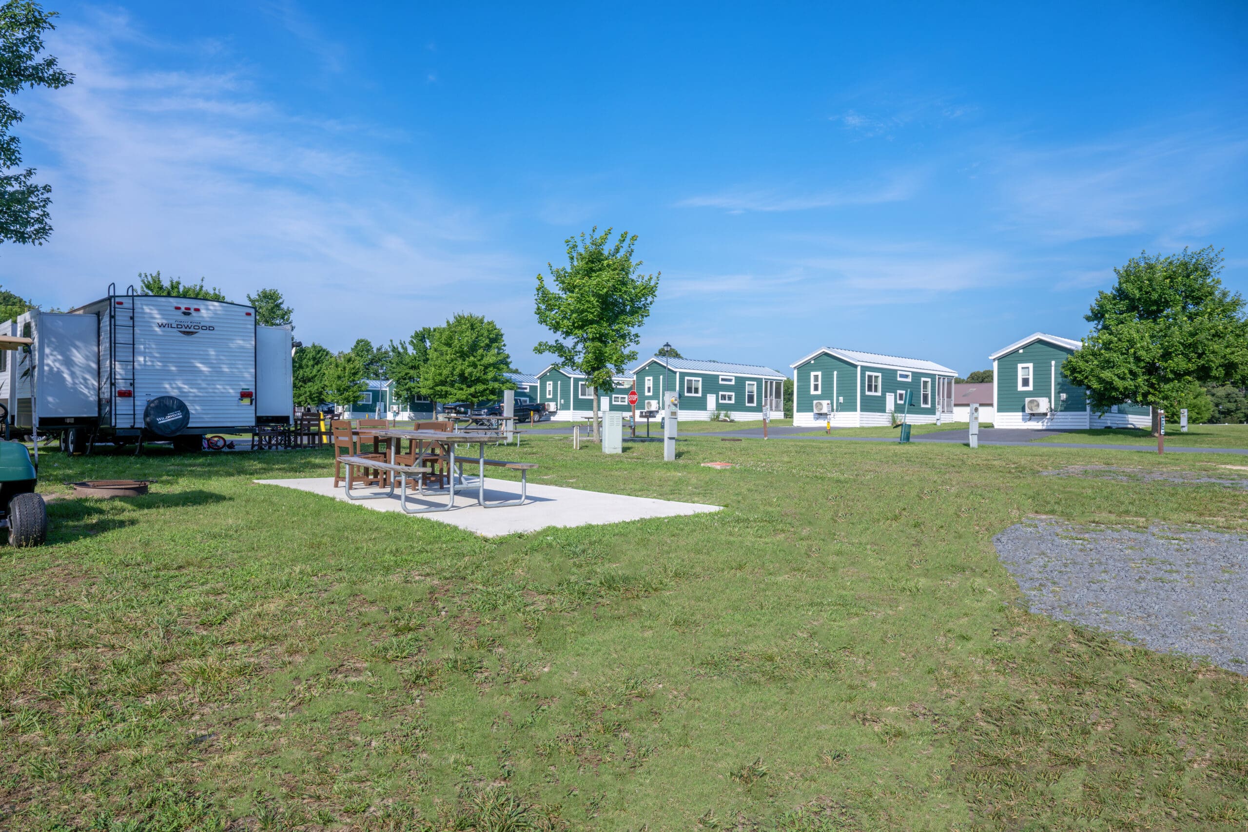 Deluxe Back-In FHU sites are located close to the start of each row and just steps from all the amenities, featuring a spacious patio with NEW polywood furniture for ultimate comfort, plus full hook-ups, grills, and a minimum of 40ft x 50ft space—please note some sites require a 50ft water hose.